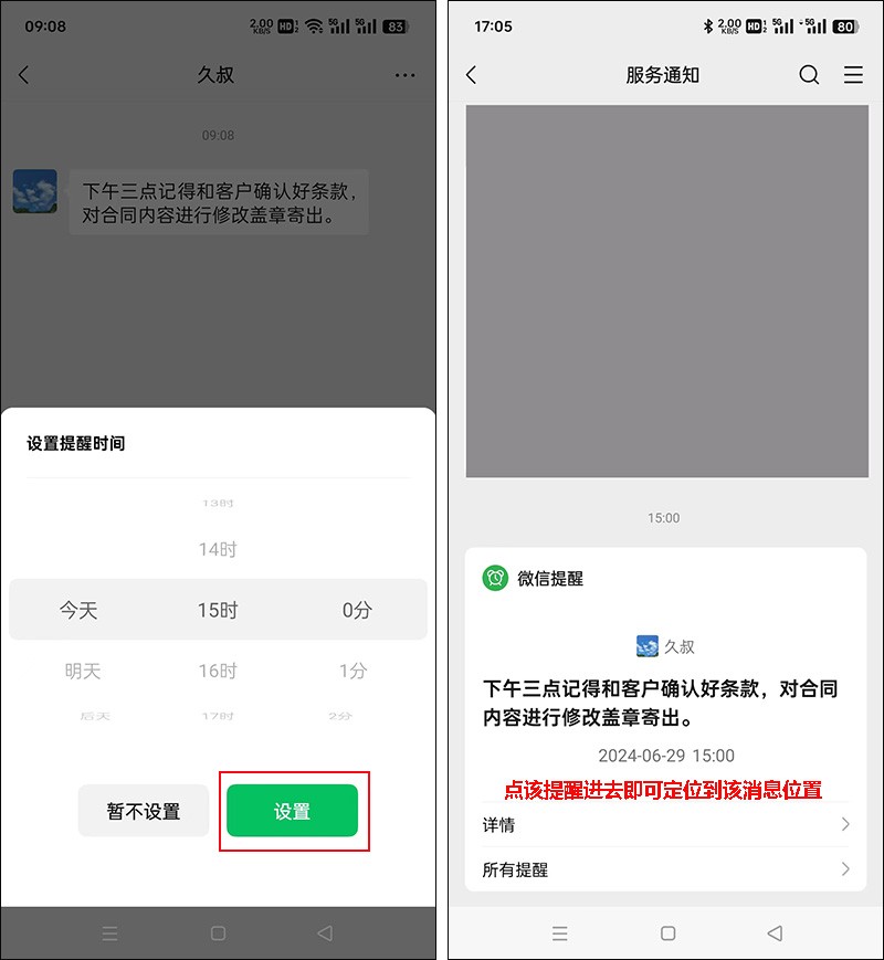 我们可以在领导发来工作安排的消息时,就预估我们大概会在几点回到公司,比如下午三点回到,我们就可以直接长按这条工作安排的消息,选择【提醒】,然后设置提醒时间为下午三点,等下午三点我们回到公司时,微信就会给我们推送一条服务通知,点该条服务通知进去,就能直接定位到这条工作安排的消息了。也就是说,你希望什么时间再次查看这条已读消息,就设置提醒时间为什么时候,到了时间微信就会推送给你,通过微信的通知点进去就能定位到你想查看的这条消息这里,方便自己查看该消息及前后的聊天记录。