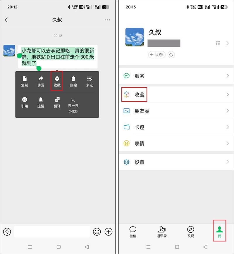 另外,如果有一些经常需要反复查看的微信消息,或者自己日常生活中常常需要用到的微信内容,比如朋友告诉我们的好吃的店,比如一些工作流程等,我们不妨直接放到微信收藏里,长按该微信消息,选择【收藏】就可以收藏了,需要查看该消息的时候,点微信右下角的【我】-【收藏】,就可以在微信收藏里快速找到该条内容,也非常实用。