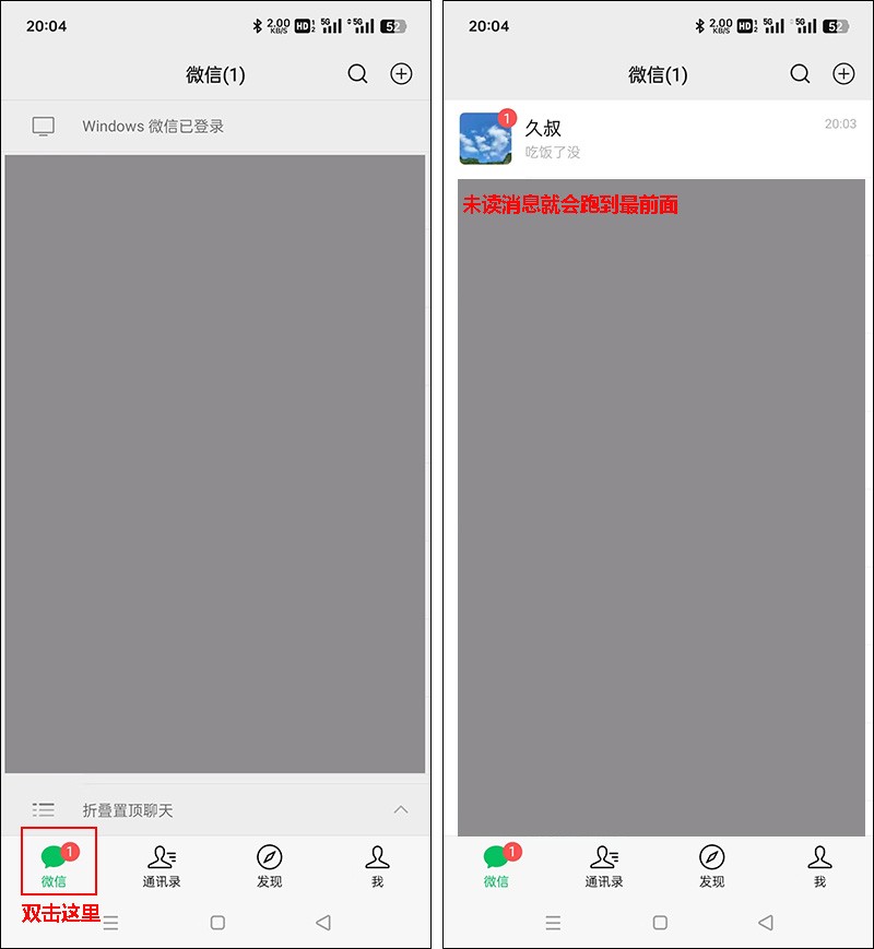 先说说微信怎样定位未读消息。当微信收到新消息,而自己的微信置顶本来就置顶了不少人和微信群,再加上自己的微信群也比较多,虽然屏蔽了,但群里有新消息这些群还是会跑到前面来,以至于把新消息都给埋没到后面去了之后,要是通过下滑翻找的方式找未读消息,挺费劲的。针对这个问题,其实微信早就设计好了解决方法,只要双击左下角写有【微信】这两个字的位置,也就是左下角提示我们有未读消息数量的红色数字那,就会自动定位到未读消息的位置,如果是多个好友发来新消息,看完一个好友的之后,再次双击一下左下角写有【微信】二字的地方,就会再次定位到另外的好友发来的未读新消息的位置,非常好用。