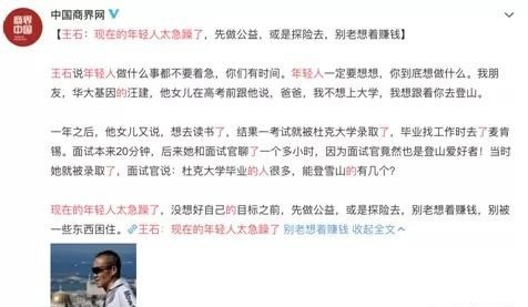前一段时间王石的一句话又犯了众怒。在一档采访中王石说现在的年轻人太急躁了,应该先做公益,或者探险去,别老想着去赚钱!然后又举了他朋友的一个女儿高考前不想上大学了,要去登山。一年之后,被杜克大学录取了,毕业后又因为有过登山的事迹通过了麦肯锡的面试,所以得出来以上那一句结论。