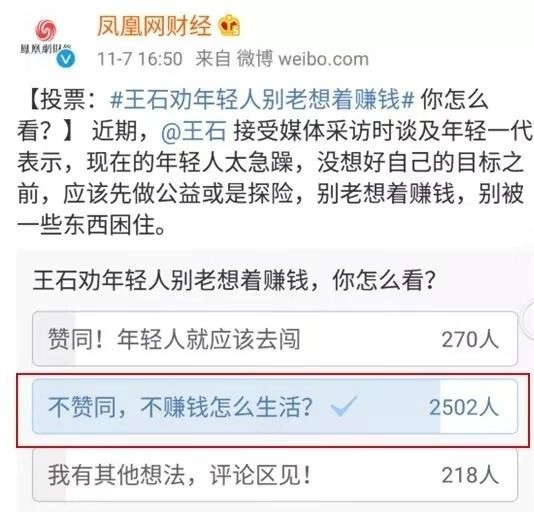 普通家庭出身的年轻人哪有那么多的闲情逸致去走南闯北去过雪月风花的生活?如果谁都能过的起王石先生所说的那种生活,谁愿意做一个为了房子车子还有婚姻拼命工作的996“社畜”呢?
