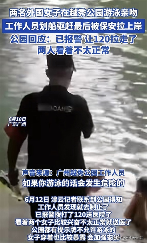 近日,有两名女子在广州越秀公园湖水中游泳,实际上公园规定是不允许游客下水的。