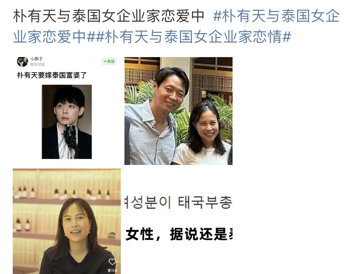11月4日,韩国演员朴有天被曝正在和泰国的一位女企业家交往。