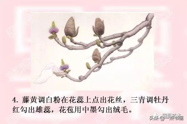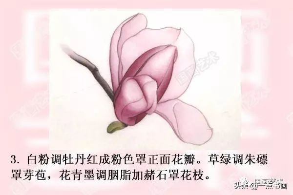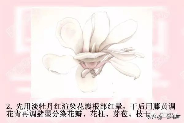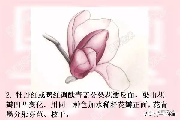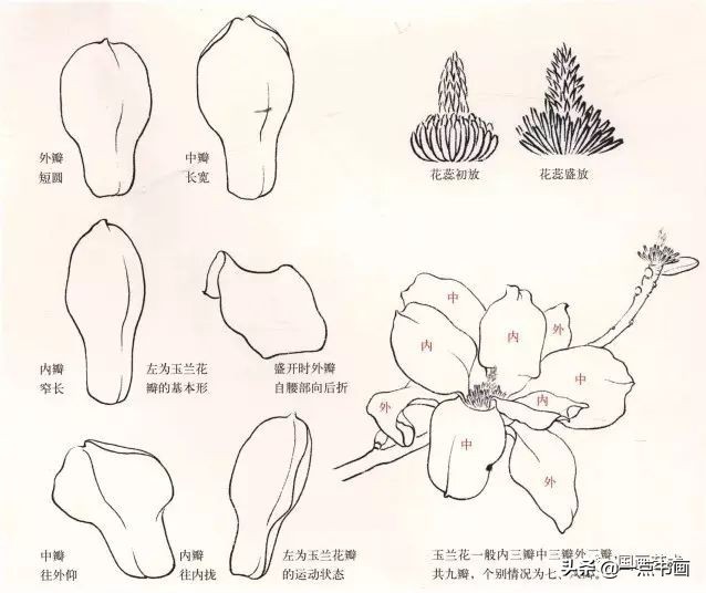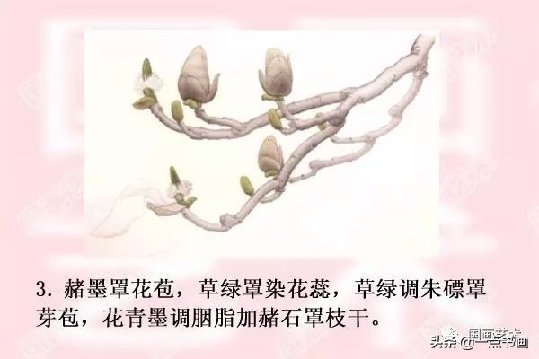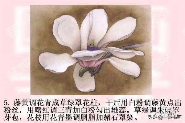 摘自天津杨柳青画社 《工笔玉兰设色技法》,王永才著,该书以玉兰花为主要内容展开对工笔画技法的讲解,包括玉兰花头的不同姿态、玉兰花苞、花蕊、花萼、枝干等的画法,还讲解不同品种的玉兰花的设色技法。我们仅分享其中的部分内容供参考,如需深入学习,请从正规渠道购买正版图书!