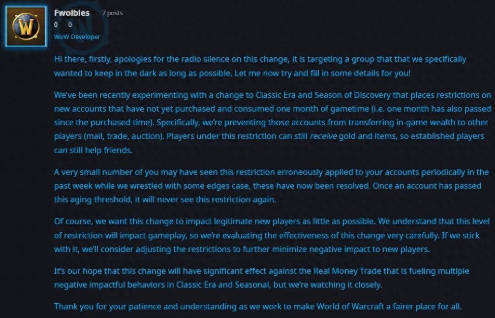 我们先来看暴雪发布的蓝帖,魔兽世界开发者Fwoibles说道,最近暴雪正在实行一项政策,对尚未购买和消耗一个月游戏时间(自购买时间起过去一个月)的新游戏账户增加新的限制。