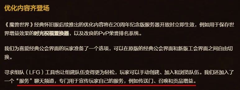 如果大家有看魔兽世界官方对于20周年纪念服的说明就可以发现,目前手动拉人是合规的,而且在游戏里还“还加入了一个“服务”聊天频道,专门用于宣传玩家自己的服务,例如传送门、召唤和贡品增益。”
