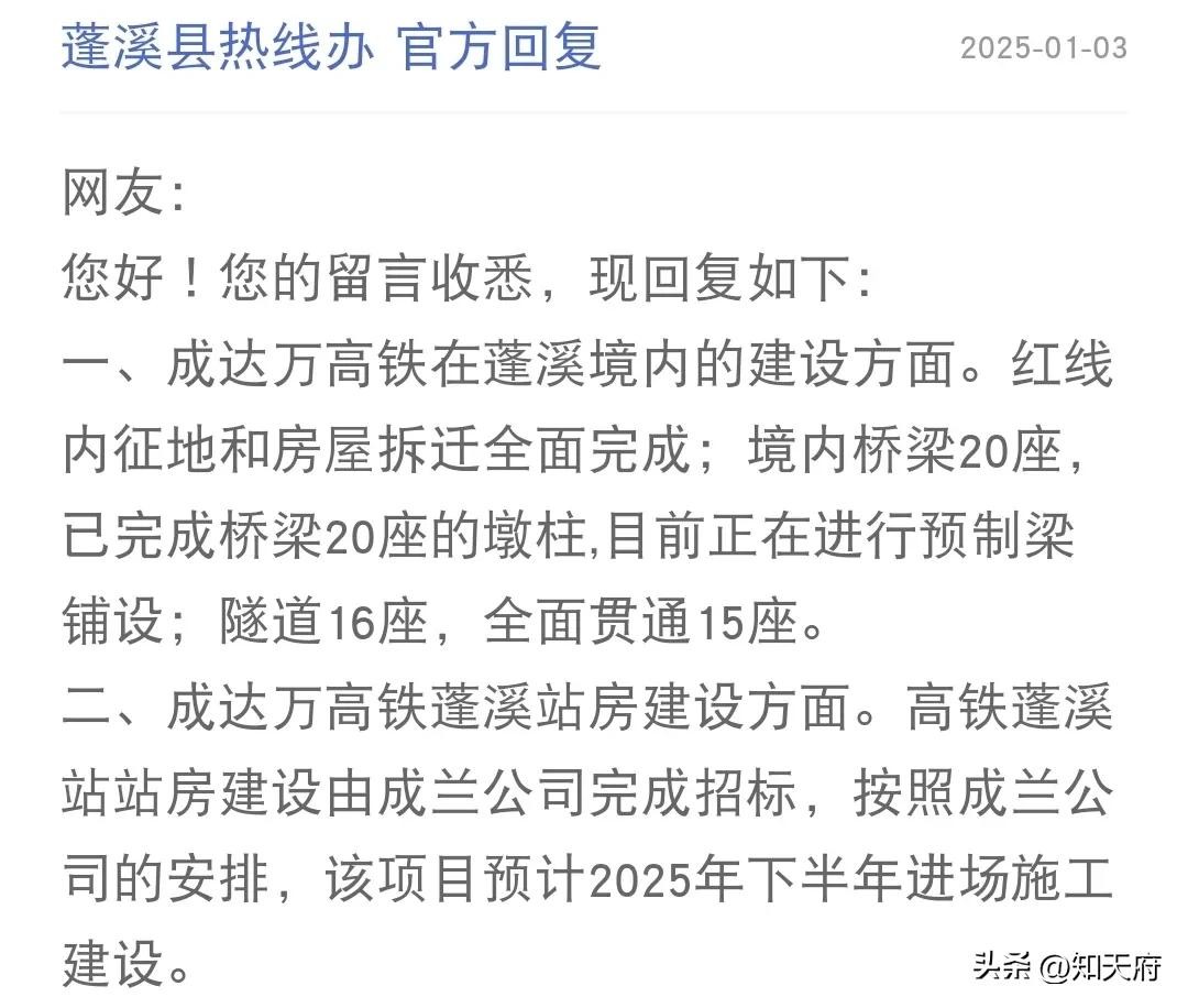 通过回复可以看到,成达万高铁在蓬溪县已完成征地拆迁,并已完成桥梁20座的墩柱,隧道已经贯通15座。至于蓬溪站的建设由成兰公司完成招标,根据相关工作安排,预计2025年下半年进场施工建设。