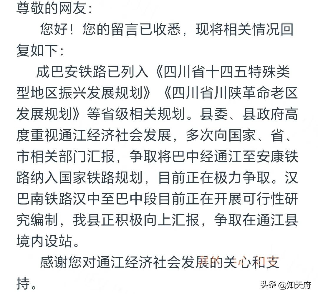 通过回复可以看到,成巴安铁路已列入四川省相关规划中,通江县相关部门也多次向国家、省、市相关部门汇报,争取将巴中经通江至安康铁路纳入国家铁路规划。至于汉巴南铁路汉中至巴中段目前正在开展可行性研究编制,通江县也在积极向上汇报,争取在通江县境内设站。