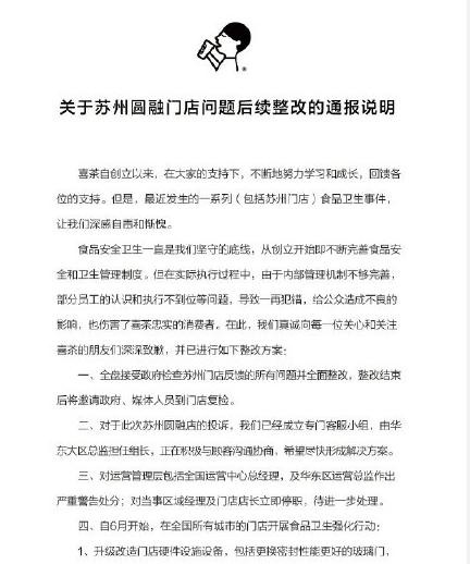 6月2日,喜茶官微发布关于苏州圆融门店问题后续整改的通报说明:运营总经理被处分,区域经理及店长停职。并表示自6月开始,在全国所有城市的门店开展食品卫生强化行动。