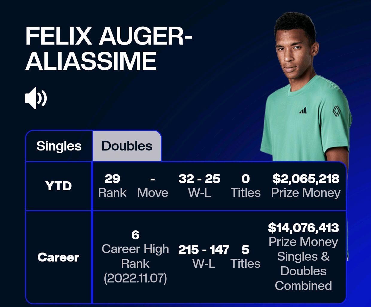 阿利亚西姆17-18岁时便已经成名,是最早暴得大名的00球员,曾经连续9次进入巡回赛单打决赛而不胜,是男子网坛一哥著名的梗。阿利亚西姆在2022赛季时有了极大的提升,这个赛季的他进入到丰收的季节,年度拿到了5个单打冠军,并打进了一站大满贯赛事半决赛,年底以积分排名第6位进入到年终总决赛之中,个人的战绩和声望达到了顶峰。