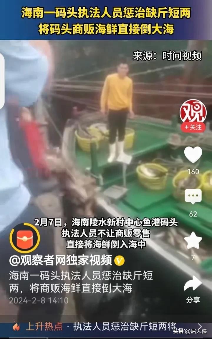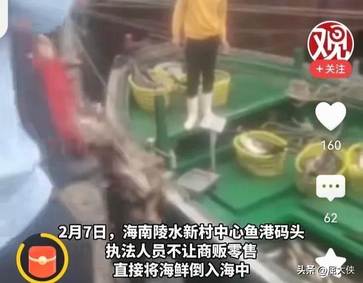 据【观察者网】独家视频报道,2月7日海南陵水新村中心渔港码头,执法人员不让商贩零售海鲜,把商贩船上的海鲜一筐一筐直接倒入海中。