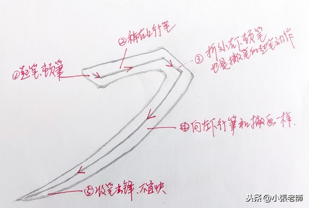 所以,起笔时就是横画的起笔,稍顿然后斜上抗肩行笔,随后转折处顿笔(也是撇画的起笔动作),向左下方行笔,匀速出锋出尖。