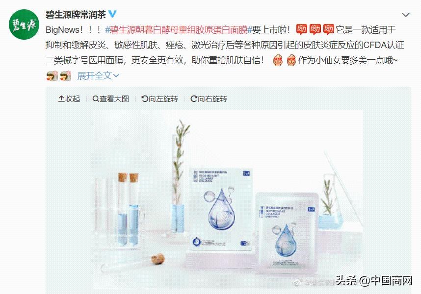 碧生源官方微博内容显示,即将推出的朝暮白酵母重组胶原蛋白面膜是一款用于缓解激光治疗等各种原因引起的皮肤炎症反应的医用面膜。