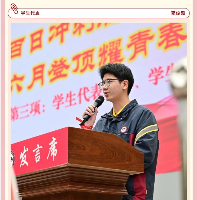 学生代表窦俊毅发言。他回顾了高三的奋斗历程,表达了对老师和同学的感恩之情,并鼓励全体同学在百日后铸就辉煌。