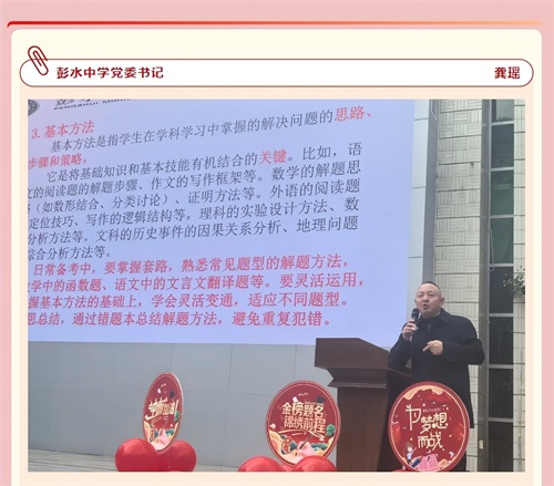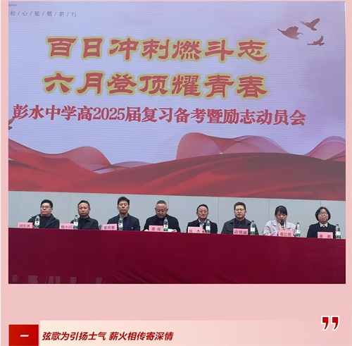 2025年3月3日下午,彭水中学高2025届全体师生齐聚中心广场,以昂扬的姿态拉开了百日誓师的序幕。彭水中学党委书记龚瑶,党委副书记、校长张杰,党委副书记蔡照攀,原副校长许洪斌,党委委员、纪委书记钱小川,党委委员、副校长晏江霞,年级主任刘在洪,年级党支部书记蒋妮出席活动。此次活动旨在通过倒计时100天的仪式,帮助学生营造备考氛围,凝聚奋进力量,激发拼搏热情,树立必胜信心。