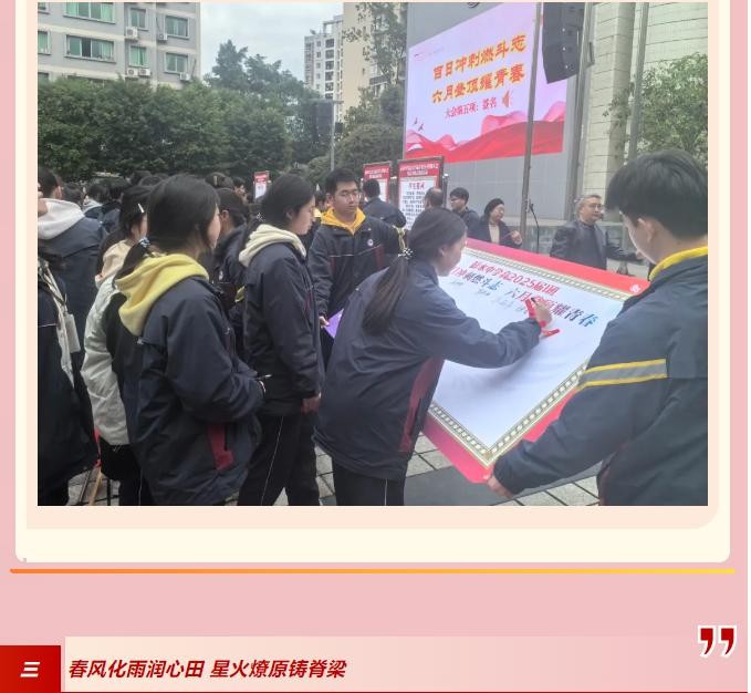 领导教师挥毫主横幅,学子执笔班级旗,一笔一画皆化作冲刺百日的铮铮誓言。