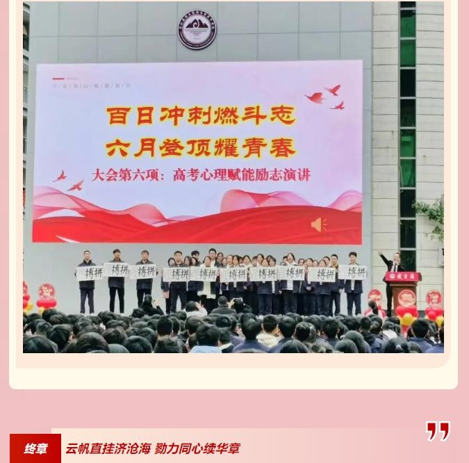 此次百日誓师活动,以仪式感唤醒内驱力,以榜样力凝聚向心力,以专家智激活行动力,为高三学子锚定冲刺坐标、注入了精神强心剂。彭水中学将始终秉持“厚土嘉禾”的理念,以教育匠心托举青春梦想。全体师生必将以笔为剑斩荆棘,以梦为马骋乾坤,在2025年高考中续写彭中辉煌!