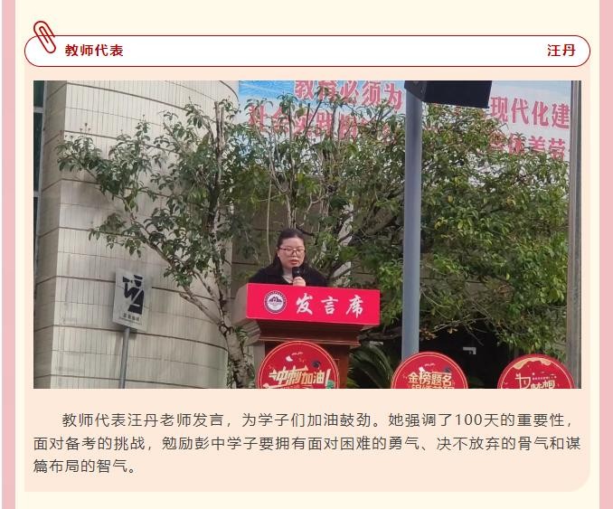 教师代表汪丹老师发言,为学子们加油鼓劲。她强调了100天的重要性,面对备考的挑战,勉励彭中学子要拥有面对困难的勇气、决不放弃的骨气和谋篇布局的智气。