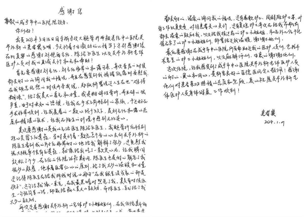 出院后,裴先生送了一封感谢信,讲述了这段跨越三千公里的医患深情。