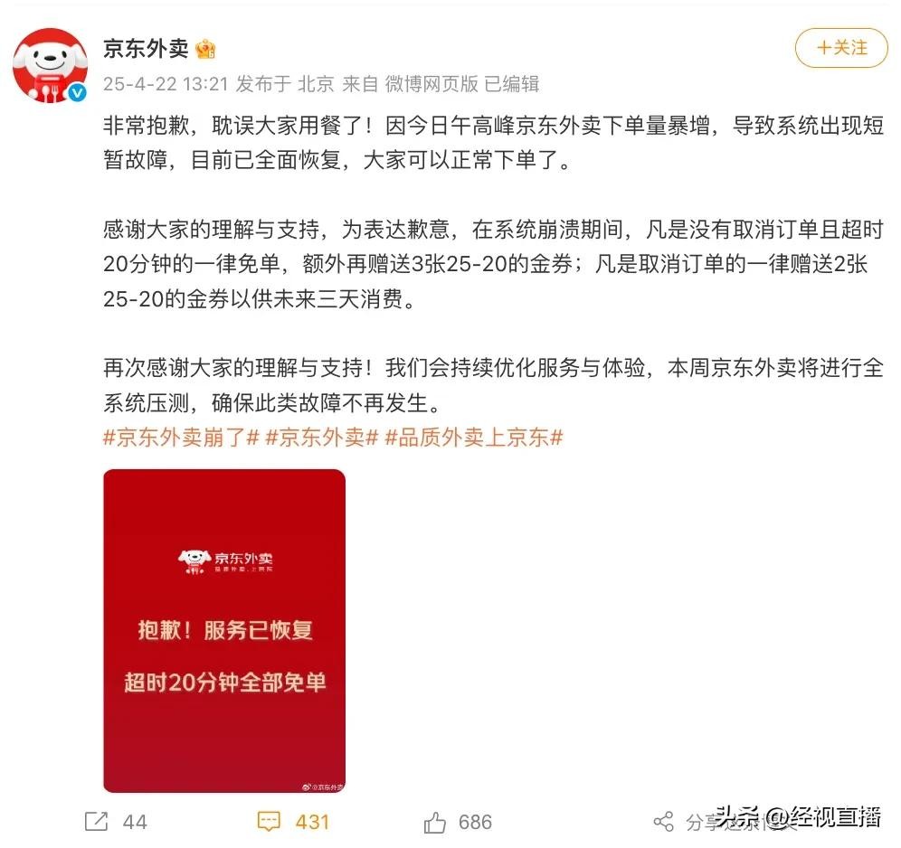 4月22日,“京东外卖崩了”相关话题迅速冲上热搜。当日13:21,京东发布回应表示:因今日午高峰京东外卖下单量暴增,导致系统出现短暂故障,目前已全面恢复。为表达歉意,在系统崩溃期间,凡是没有取消订单且超时20分钟的一律免单,额外再赠送3张25-20的金券;凡是取消订单的一律赠送2张25-20的金券以供未来三天消费。
