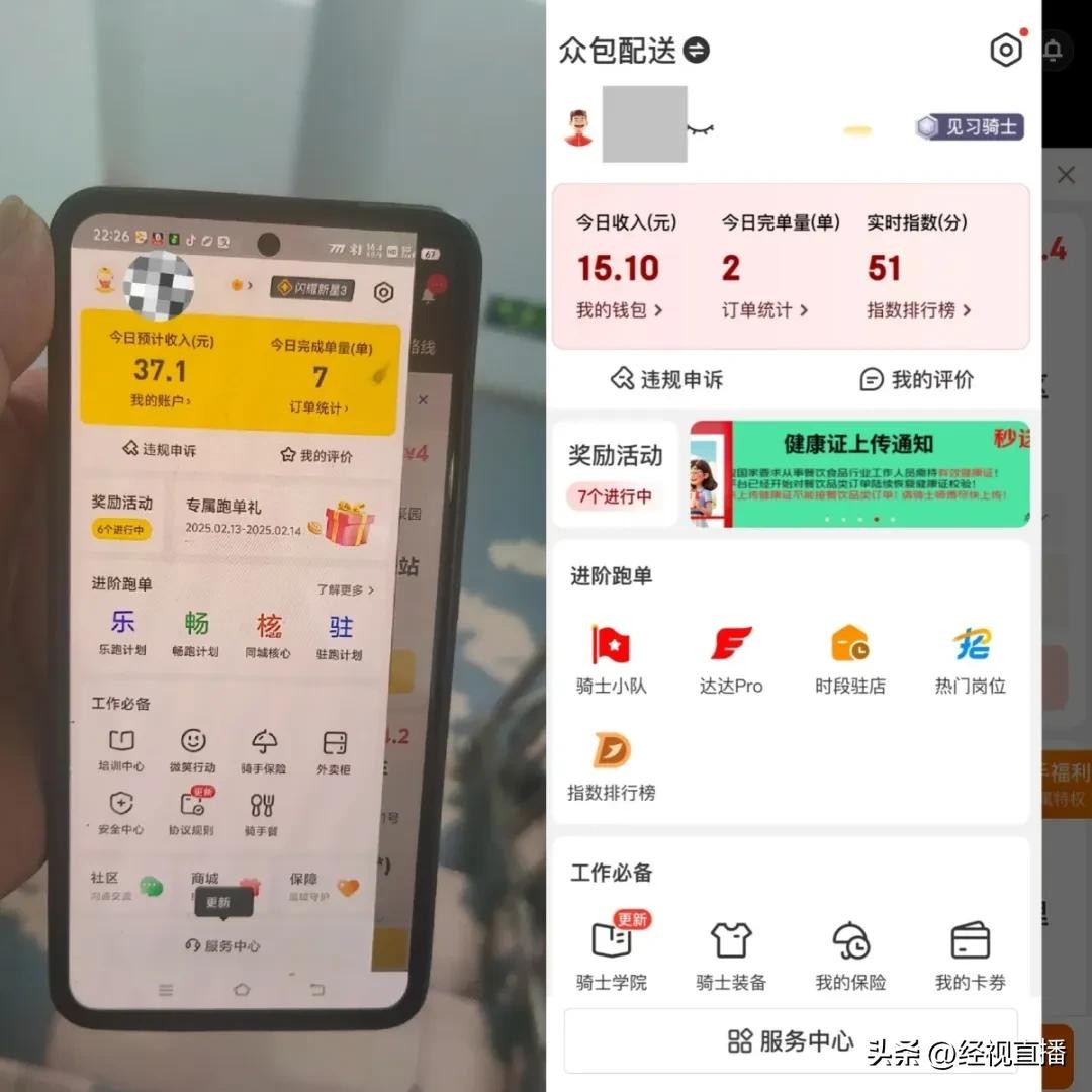 “美团骑手”APP页面与“达达秒送骑士”APP页面对比,左“美团骑手”,右“达达秒送骑士”
