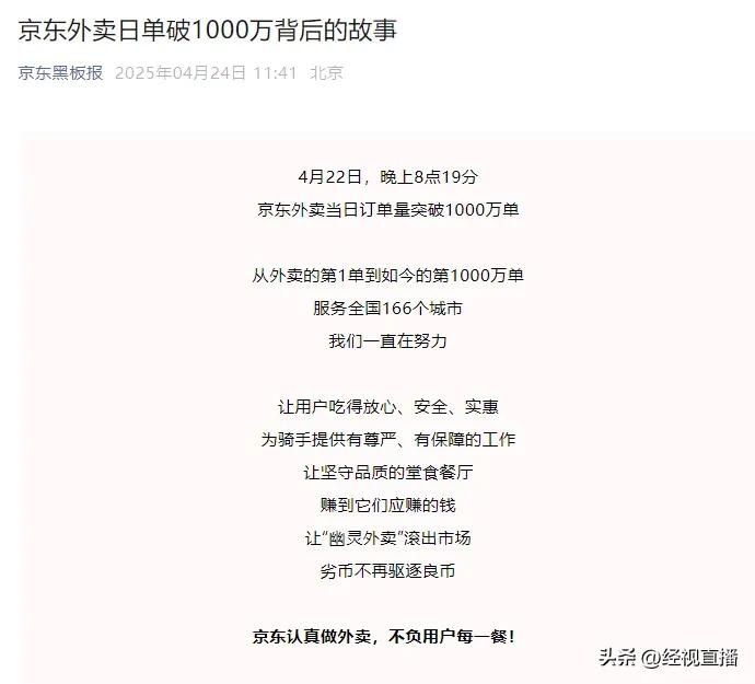 据京东黑板报官微消息,4月22日晚上8点19分,京东外卖当日订单量突破1000万单。