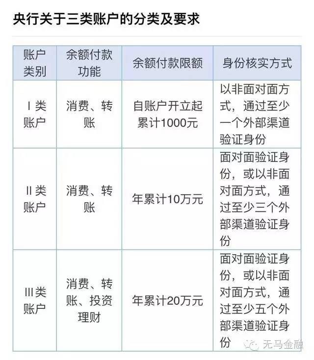 关于央行的规定中,对第三方支付账户按照身份验证的不同程度,分成三类支付账户,享受不同的便利。这些东西要细说起来,估计你看了也头大,这里直接上个图,如果看不明白也没关系。对一般人来说不用管那么多,想便利就按支付宝、微信支付他们怎么说就怎么整吧。
