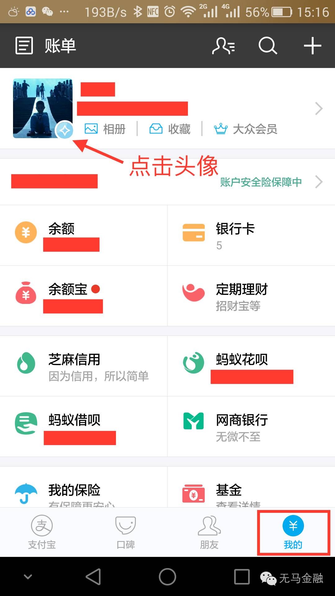 步骤1:查看一下自己实名认证了没有?打开手机上的支付宝App,点击下面菜单栏中的“我的”,然后点击左上角的头像。