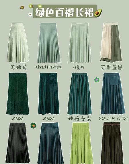 绿色调的百褶裙颜色温暖,给人感觉平易近人,无论是上班还是约会都能给人好印象。墨绿色给人高贵感,年纪大可以选择这个色系,比黑色多了一份优雅时尚。