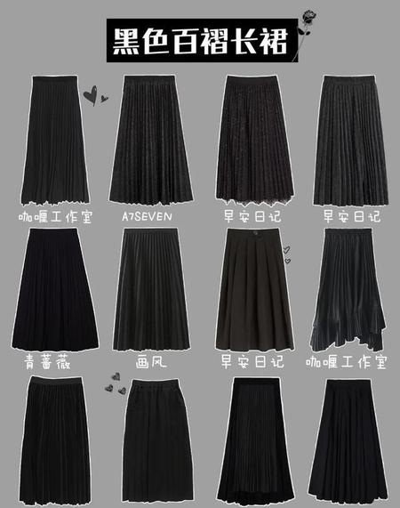 黑色百褶裙 建议与浅色或图案搭配,与衬衫搭配起来,有一种正式和时髦的碰撞!与毛衣简单搭配,轻松打造休闲风!与艳丽颜色上装,带来一些视觉冲击,可以说是让整体的搭配更具层次感!