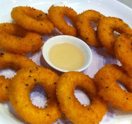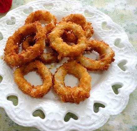 1.冷冻的鱿鱼圈,用开水焯一下,取出,撕去外皮。2.加入盐,料酒,胡椒粉腌制15分钟。3.鸡蛋打散,淀粉,面包糠备好。4.鱿鱼在面粉里滚一下,再放到鸡蛋里蘸匀,再放到面包糠里滚一下。5.蘸好的面包圈放到一个无水的干净盘子里。6.锅内油烧热,下入鱿鱼圈小火炸制金黄捞出,捞出装盘。