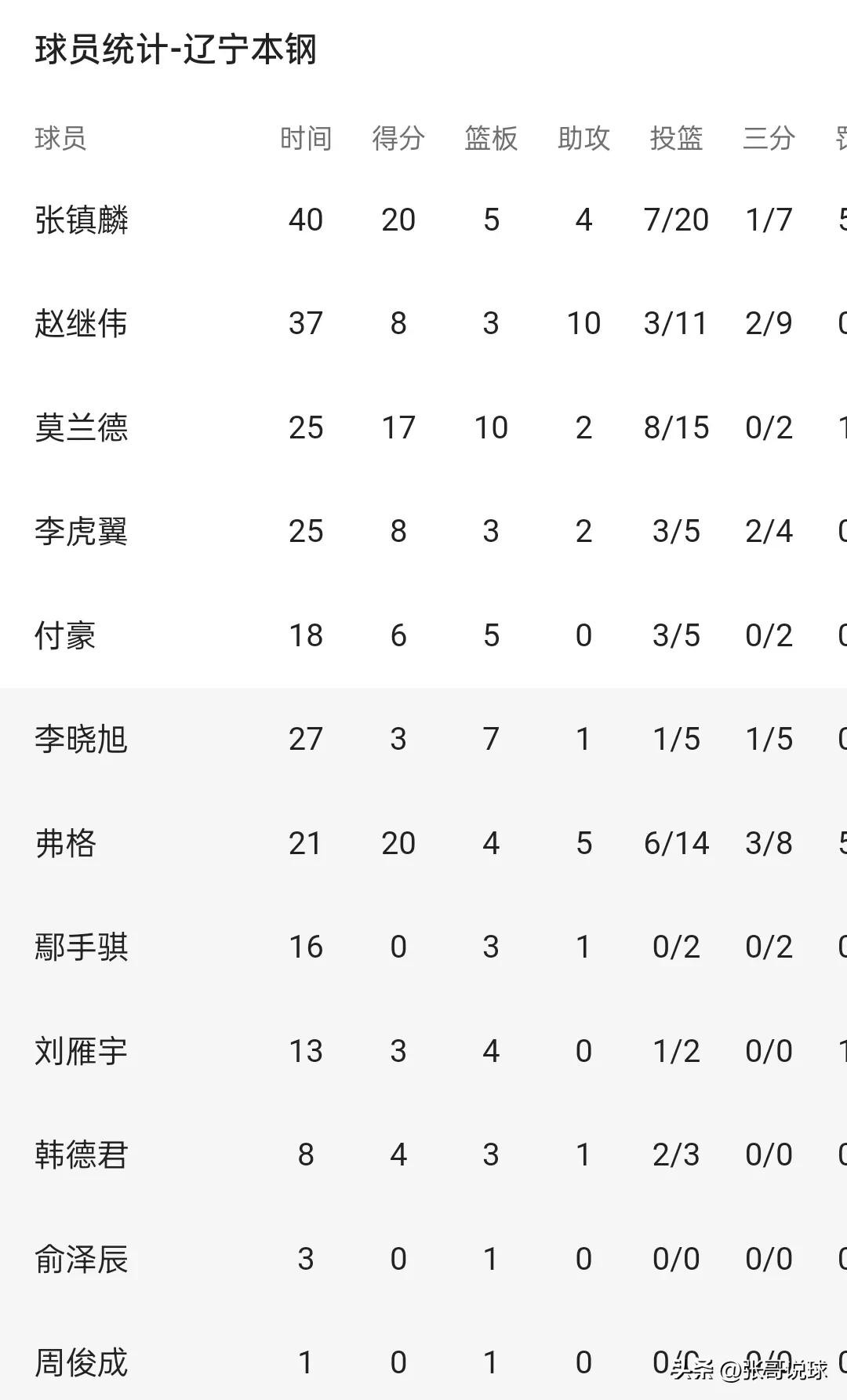 辽宁队篮板球赢8个,两支球队三分球都是39次出手,辽宁命中9个,福建命中11个。助攻辽宁26-14领先。辽宁队张镇麟20分5板4助,赵继伟8分3板10助,莫兰德17分10板,弗格20分。福建队杰曼28分,梅克12分12板,邹阳9分15板3助。