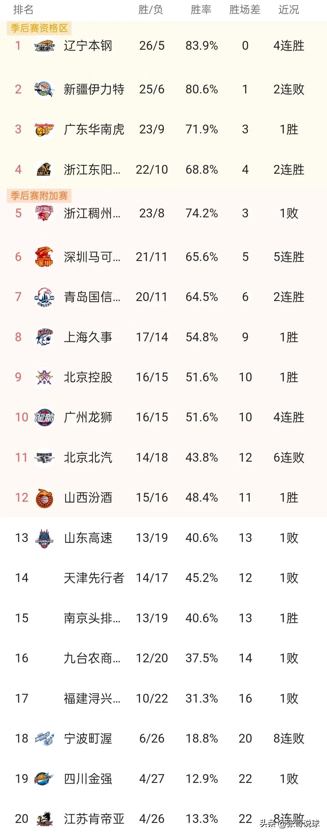 CBA常规赛第32轮,辽宁89-75战胜福建,辽宁26胜5负积57分排名第一,新疆队25胜6负积56分排名第二。广东104-87大胜北京,广东队23胜9负排名第三,北京队6连败14胜18负排名第12。