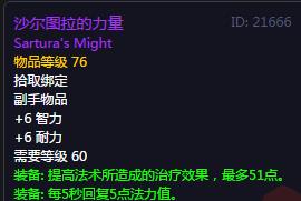 沙尔图拉的力量:作为一个副手武器 ,这个装备和虚妄预言者节杖一结合,那就是相当的奥利给了,这个装备掉落于鱼腩BOSS沙尔图拉,而且获取难度不大,很轻松就可以获得,我们来看看这件武器的一个属性,首先它给到的白字属性是6智力和6耐力,而绿字属性则是可以提升法术造成的治疗效果,最高可达51点,除此之外,每5秒回复5点法力值,整体上来讲还是不错的,至少比生命花高一筹。想想当时,不少牧师为了拿生命花环可是费了大力气,所以现在有这个沙尔图拉的力量这个副手,也是可以的。