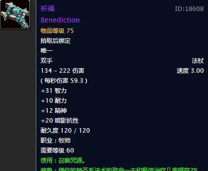 祈福:当然也有不少玩家可能会使用祈福的,毕竟这把法杖是兼顾治疗和DPS的。而且这把武器外形拉风,并且还能每隔30分钟切换成咒逐,而且这个武器的属性也是非常给力的,装备后的白字属性是31智力10耐力12精神以及20点的暗影抗性。而绿字属性则是可以使得致命一击和极效治疗几率提高2%,而且还可以提高生命值106点,就凭这些属性,这把武器用到开荒NAXX也没有什么问题。