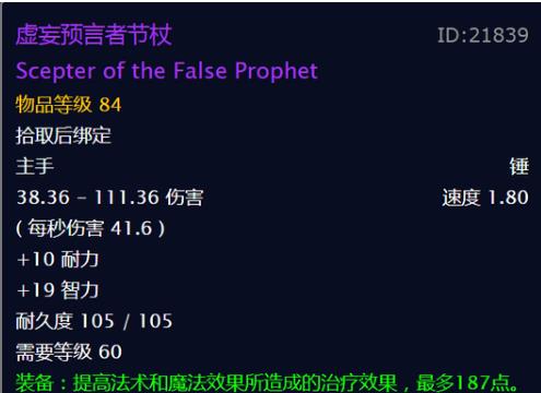 虚妄预言者节杖:这个武器掉落于安其拉神殿最终BOSS克苏恩,装备等级相当可以,高达84级。我们先来看看这个装备的一个属性,首先它提供的白字属性是加10点耐力、19点智力。而绿字属性也是非常给力,装备后给到的一个治疗效果加成高达187点,除此之外每5秒回复3点法力值。总之这是一个非常极品的治疗武器,如果再配一个副手,比如沙尔图拉力量的话,治疗的加成会更高。