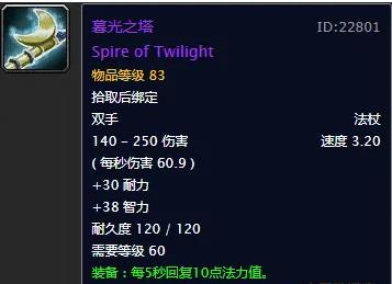 暮光之塔:另外在即将到来的NXAA,还有一个非常给力的适合牧师的装备。我们来看看这个装备的属性,首先白字属性上30点耐力和超高的38点智力,就是非常一个优越的数据,而绿字属性则是5秒回蓝10点,这弥补了没有精神属性的劣势,另外装备后还可以提升了法术治疗效果178点。总体来讲,在NXAA拿不到鸡腿杖,完全可以用这个。