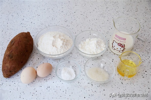 所需材料:【饼皮材料】:鸡蛋2个,牛奶150克,白糖30克,低筋面粉160克,玉米淀粉40克,泡打粉4克,玉米油30克,【紫薯馅】:去皮紫薯200克,白糖20克