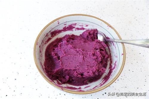 2、利用这时间做紫薯馅,紫薯去皮切成薄片,放入蒸锅蒸熟,取出加入白糖,压成细腻的泥状备用