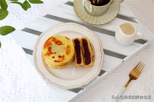4、 放入紫薯馅,再盖上另一个煎好的饼壳,继续中小火煎至两面金黄色即可