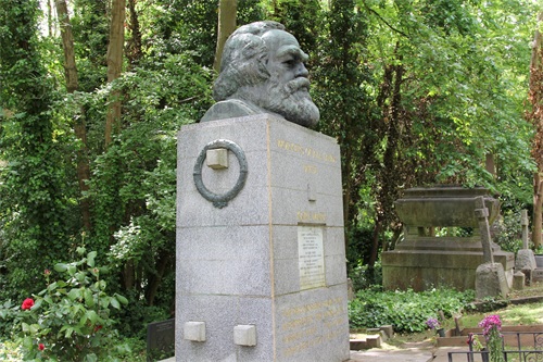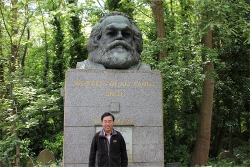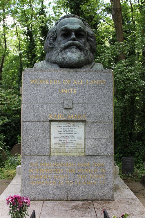 灵魂毕竟是缥缈的,墓地则提供了一块可跨越时空让生者与逝者面对面交流的地方,是生者对逝者的缅怀之地。2003年,我在法国里尔科技大学作访问学者时曾在卢森堡转车前往德国科隆到过马克思故乡特里尔,1818年5月5日,马克思就诞生在这座千年古城里,我也曾到过马克思写《共产党宣言》的比利时布鲁塞尔大广场的“白天鹅餐厅”。这次来英国一直就想来这里瞻仰一下马克思墓,此行总算了结了一个多年的心愿了。