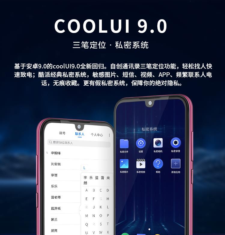 酷派cool 9预装基于Android 9.0深度定制的coolUI 9.0系统。自创通信录三笔定位功能,轻松找人快速致电。同时搭载酷派经典私密系统,敏感图片、短信、视频、APP、频繁联系人电话等等无痕收藏,搭配假私密系统,保障个人隐私。