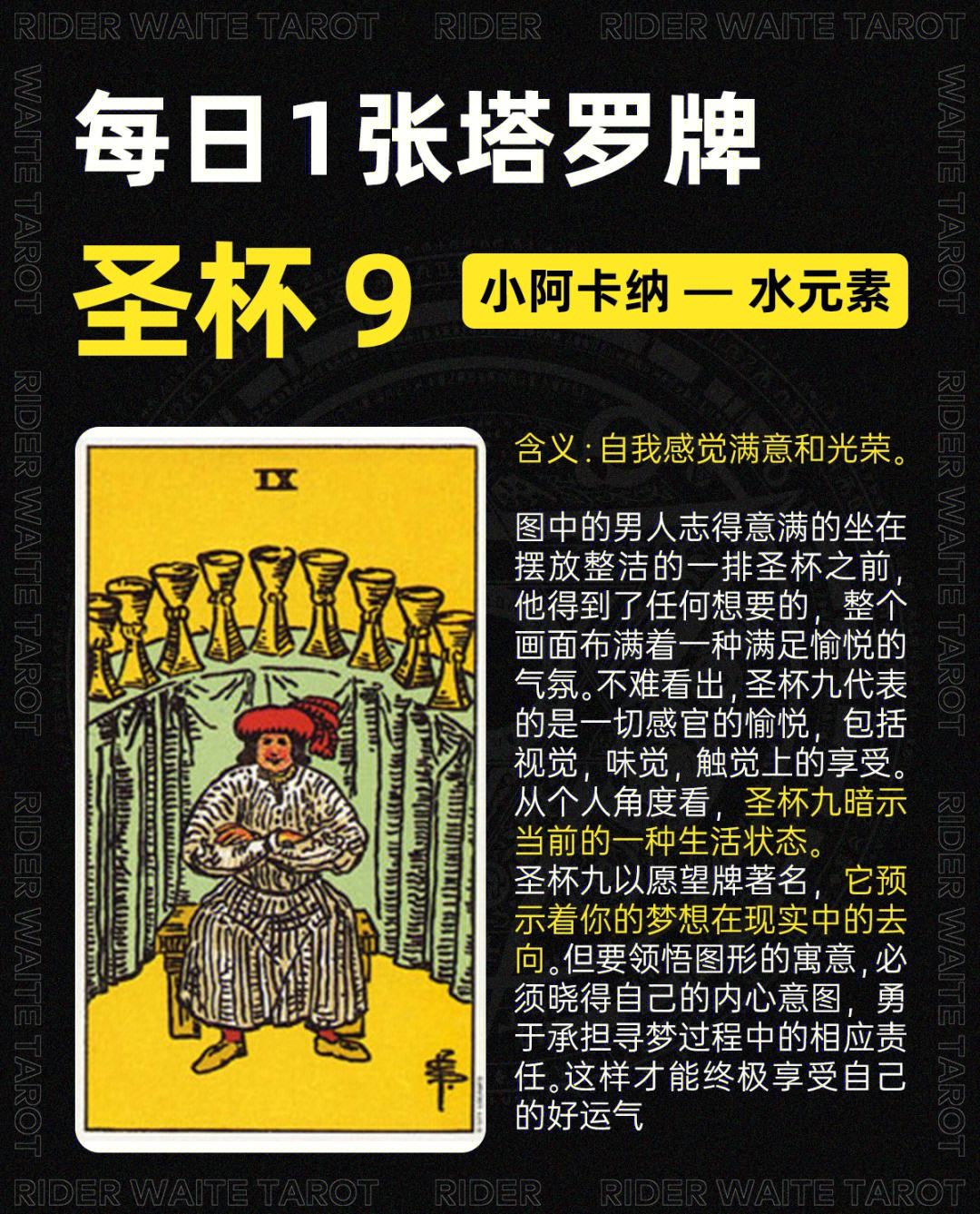 圣杯九这一张牌代表着,目前正是一段内在与外再互相调和得很好且满足现况的牌,虽然在圣杯牌组里,暗示满足的牌不算少,但是能达到像圣杯九这一张牌的满足感则可以说很少,因为圣杯九这一张牌的满足感是双重的,也就是说内在与外在的满足感都具备,而在另外一方面来说,圣杯九这一张牌的出现也暗示着,目前正是一段成功的时期,之前的努力与奋斗,让外在的物质层面与内在的精神层面都丰富充满,而自己也正在这样子的情境里面享受着成果,这时候也是把那过去的经验与目前的成果拿出来与亲朋好友分享的时候了。