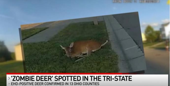 “EHD”即兽疫流行性出血病(Epizootic Hemorrhagic disease),鹿往往通过咬蠓感染该种病毒。一旦感染,鹿会在5至10天内出现嗜睡、头部垂下、流口水、眼脸肿胀、无精打采、发烧、内出血导致用膝盖爬行、对人类没有恐惧等明显症状,许多鹿会在症状出现后的8到36小时内死亡。因为类似丧尸,这种疾病被俗称为“僵尸鹿”病。