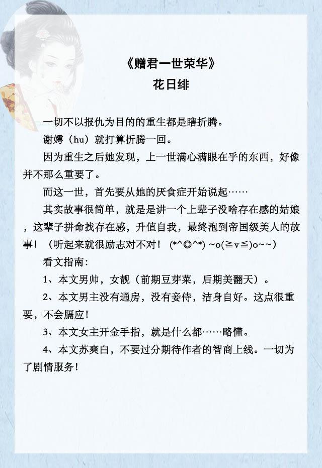 短评:古言重生甜宠文,救赎治愈,1V1,HE,苏爽白。女主上辈子爱上了渣男,而且有些死心眼,爱得有些卑微,最后声名尽毁不得不入宫当宫女。除了感情以外,女主其他方面的实力还不错,聪明睿智,办事能力妥妥的,很快便混成了帝王的左膀右臂。