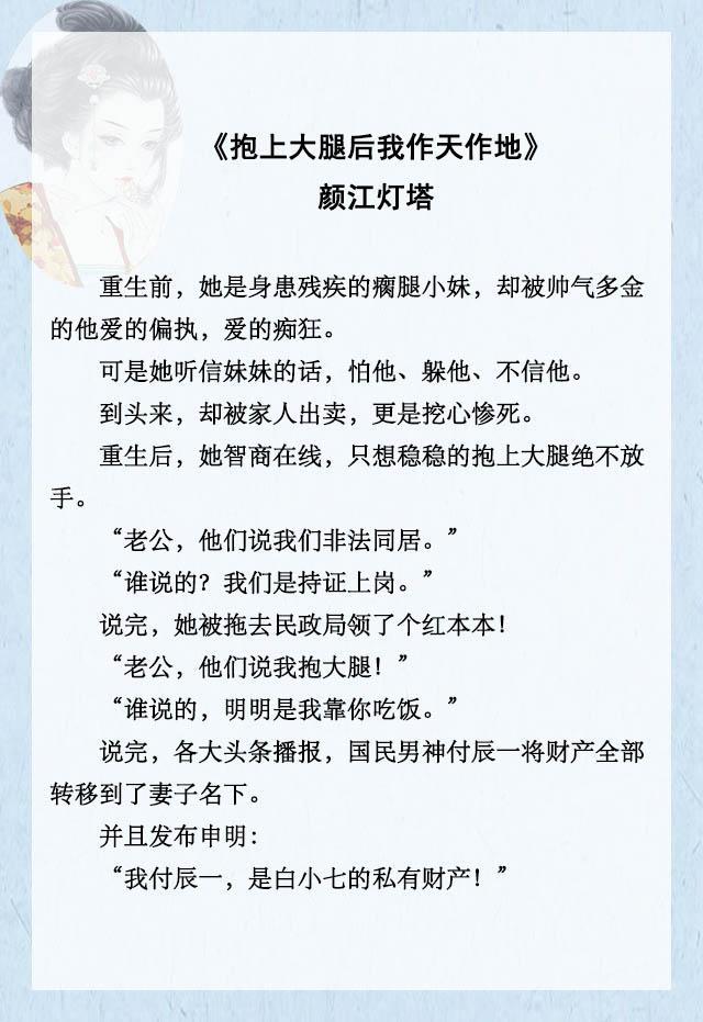 她放弃跟亲生父母相认,努力学习圆大学梦。男主是偏执大佬,两世都对女主爱得深沉,前世因为女主的妹妹从中挑拨,两人爱得惨烈。这一世女主主动抱男主大腿,被他宠上了天。女主各项技能满级,打脸逆袭很是苏爽,篇幅较长,可以阅读。