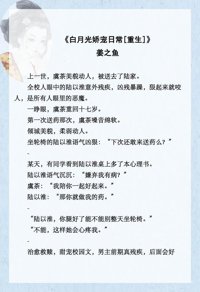 短评:起点重生爽文,校园,复仇虐渣,悔悟珍惜,女主残疾。女主原本是帝都豪门白家的千金小姐,因为天生双腿残疾被遗弃,姨婆收养了她,将她抚养长大。