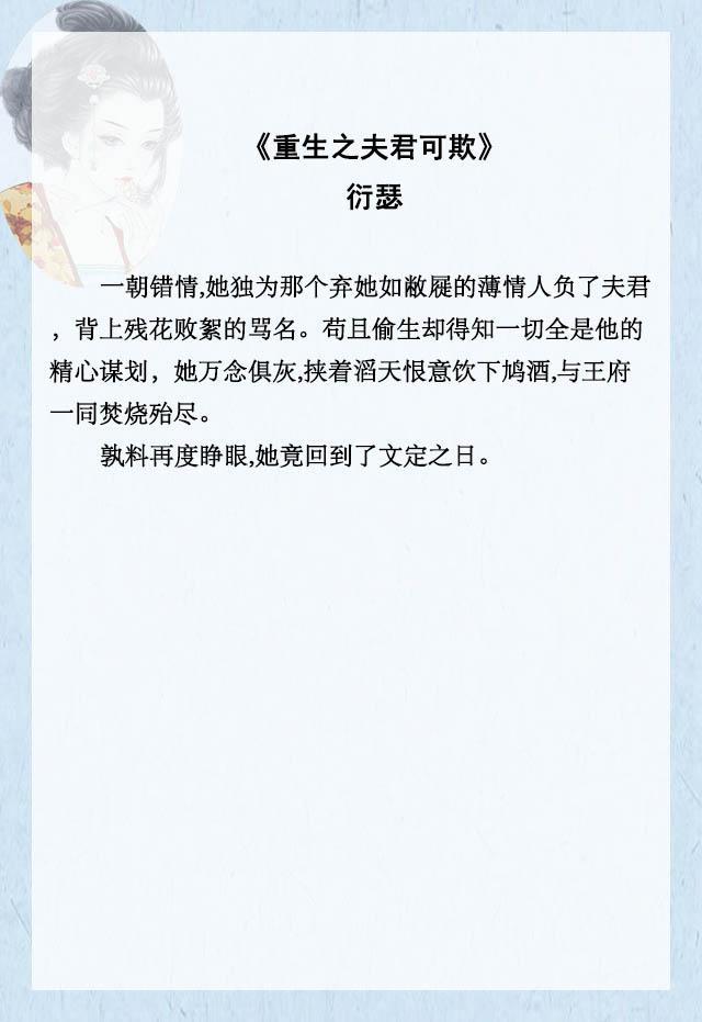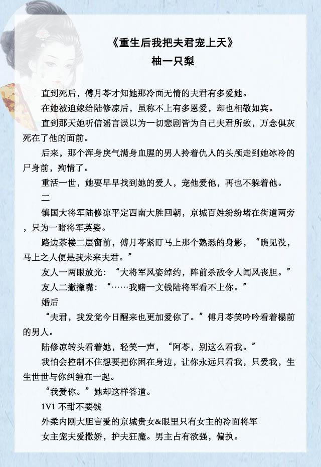短评:古言重生甜宠文,悔悟珍惜。前世,男女主遭人算计不可描述,女主清白被毁,父兄被害,沦为声名狼藉的罪臣之女。