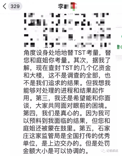 根据微信公众号“记者郝成”的爆料,石家庄市裕华区市场监管局在对达尔威公司立案调查后,李某曾向“达尔威”方面明确传递意图:想和老板(张庭夫妇)面谈解决问题,他们几亿资产和大楼被冻结了,我们的人在看守所,再继续下去,两败俱伤。”