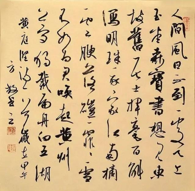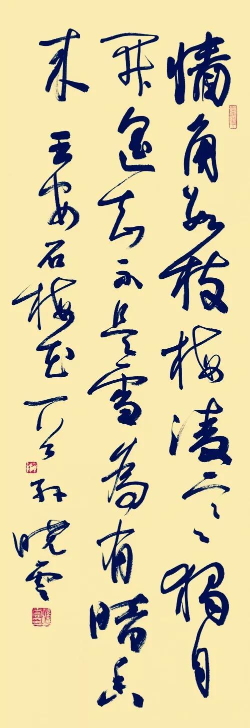 这幅作品所写内容是:王安石的诗《梅花》,“墙角数枝梅,凌寒独自开。遥知不是雪,为有暗香来”。这幅行草书墨色厚重,温润潇洒,气息流畅,富有神采。